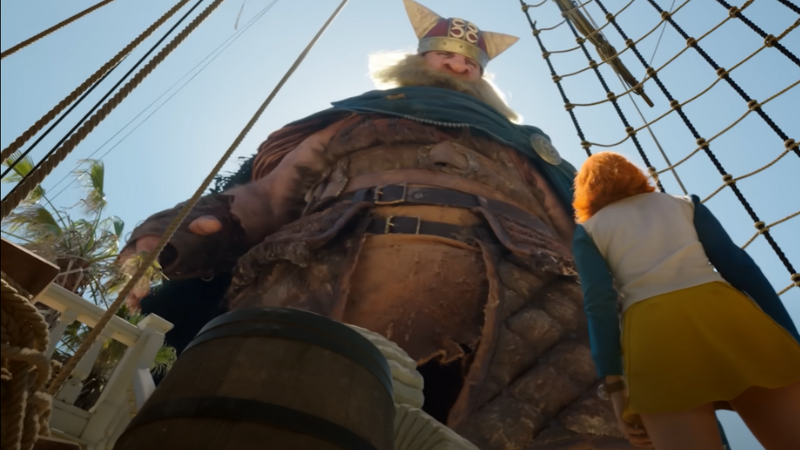 No trailer, vemos Nami (Emily Rudd) encarando Brogy do convés do navio. O gigante, co-capitão dos Piratas Guerreiros Gigantes, aparece com seu visual fiel ao anime: capacete com chifres, barba espessa e um estilo inspirado em guerreiros vikings. O ator Brandon Murray foi escalado para dar vida ao personagem, e a prévia indica que a série usará enquadramentos e truques de perspectiva para destacar a diferença de tamanho entre humanos e gigantes.